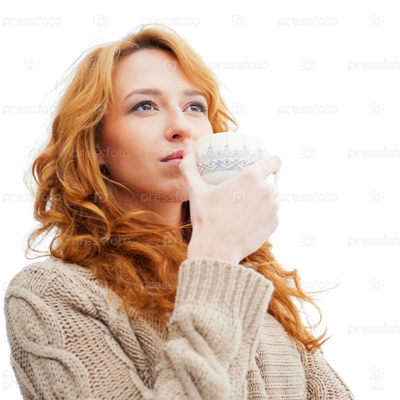 Девушка с рыжими волосами пьет кофе
