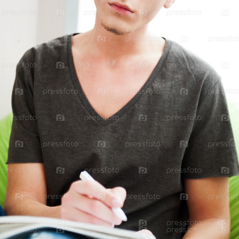 Молодой человек делает записи в тетрадке
