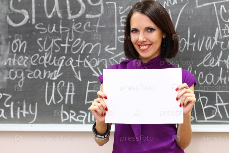 Молодая девушка с пустым листом бумаги на фоне классной доски