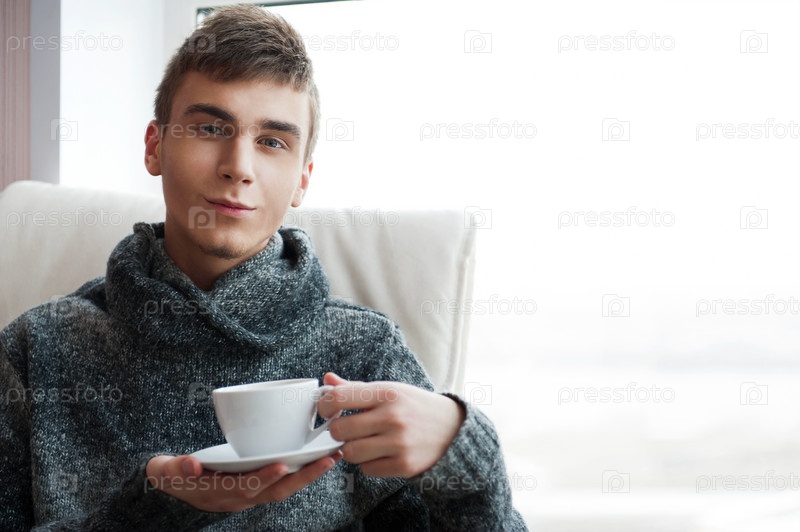Молодой человек в теплом свитере пьет кофе