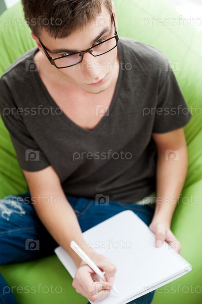 Молодой человек делает записи в тетрадке