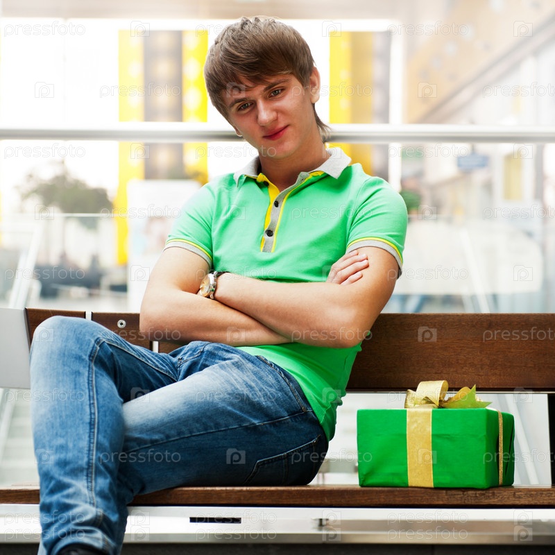 Молодой человек в торговом центре сидит на скамейке с подарком
