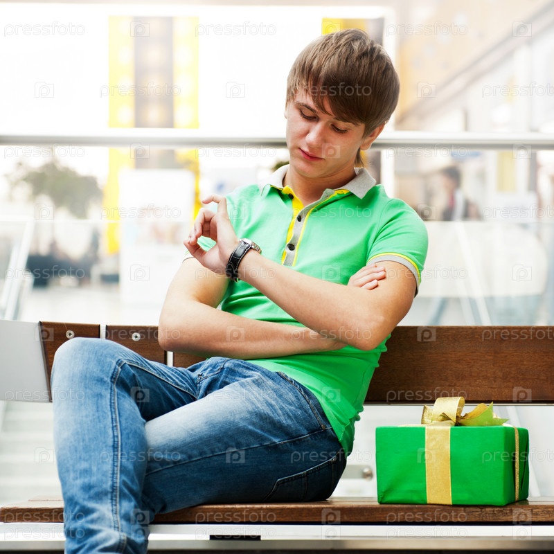 Молодой человек в торговом центре сидит на скамейке с подарком