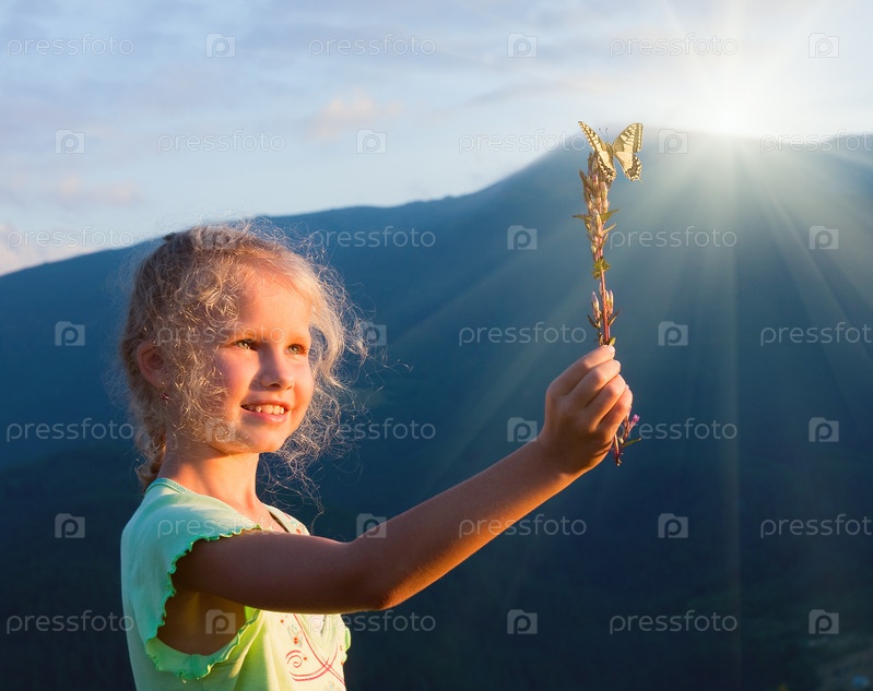 Девочка смотрит на бабочку, сидящую на веточке