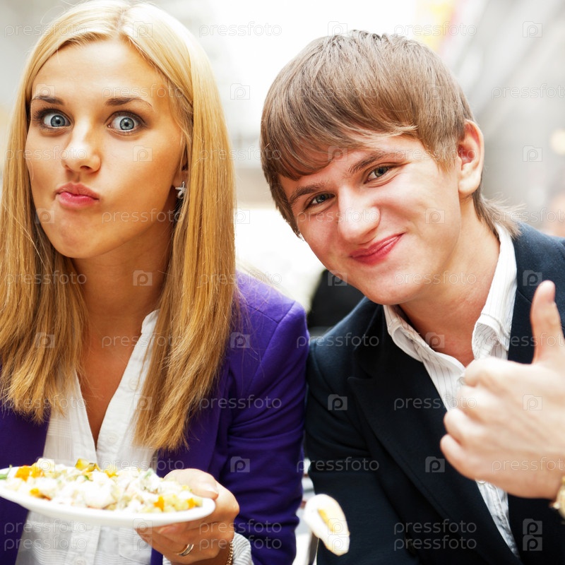 Девушка и парень едят салат в кафе в торговом центре