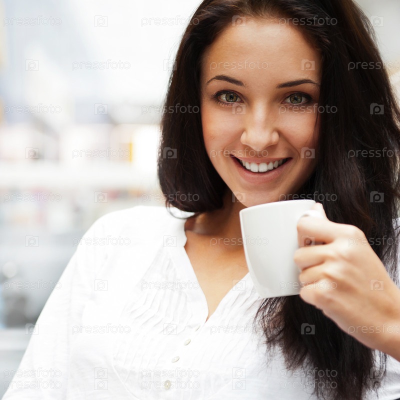 Молодая девушка в торговом центре пьет кофе