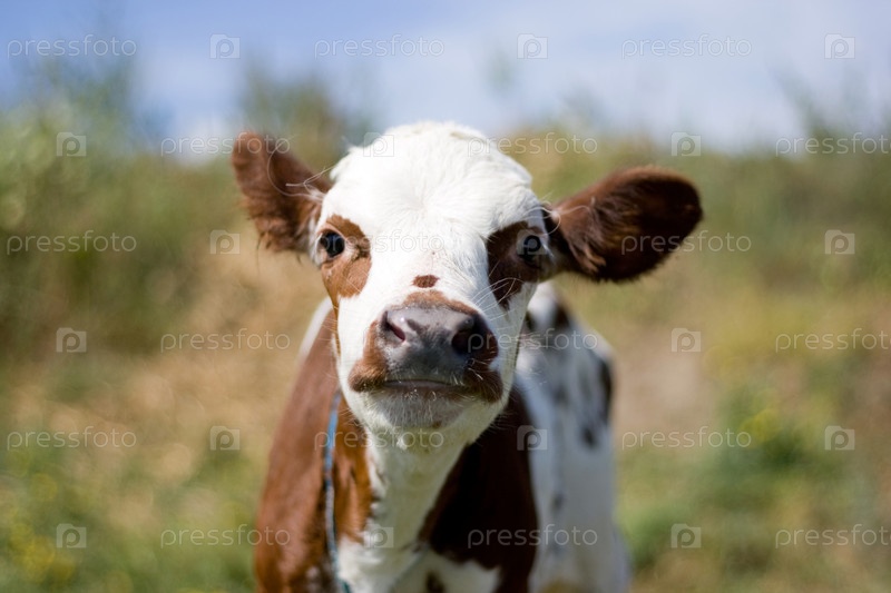 Молодой теленок пасется на лугу