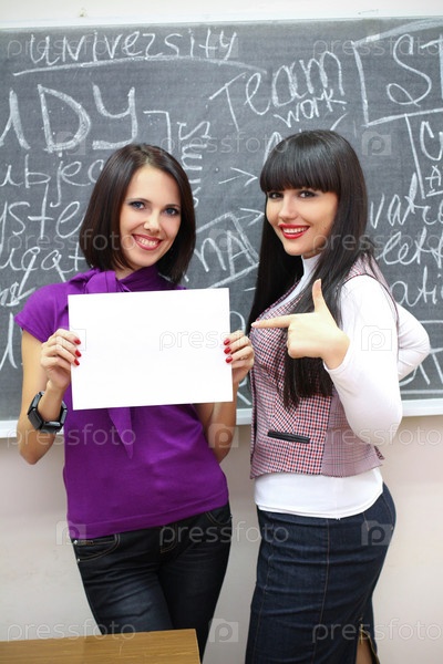 Две девушки с пустым листом бумаги на фоне классной доски