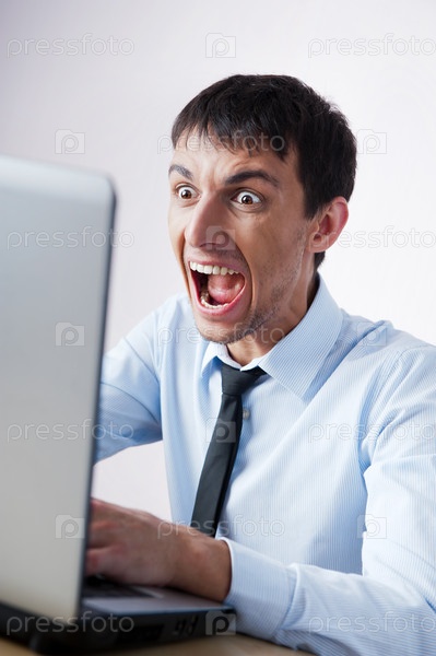Портрет удивленного молодого человека в рубашке с ноутбуком