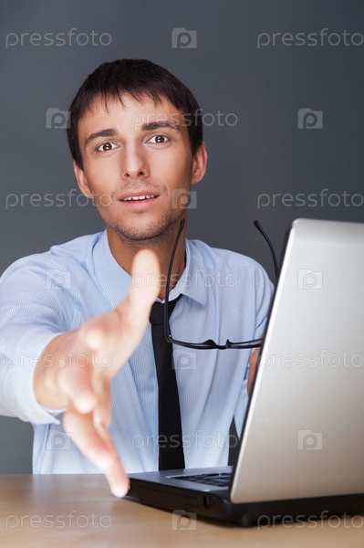 Портрет молодого человека в рубашке с ноутбуком