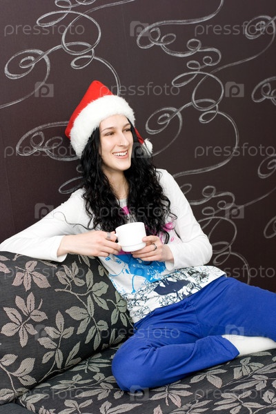 Молодая девушка на диване в шапке Санта-Клауса пьет кофе