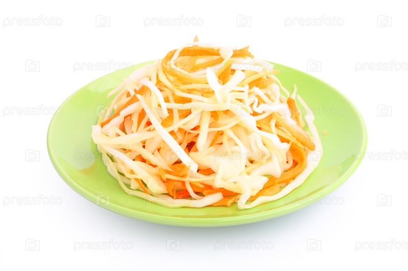 Нарезанная морковь и капуста на зеленой тарелке