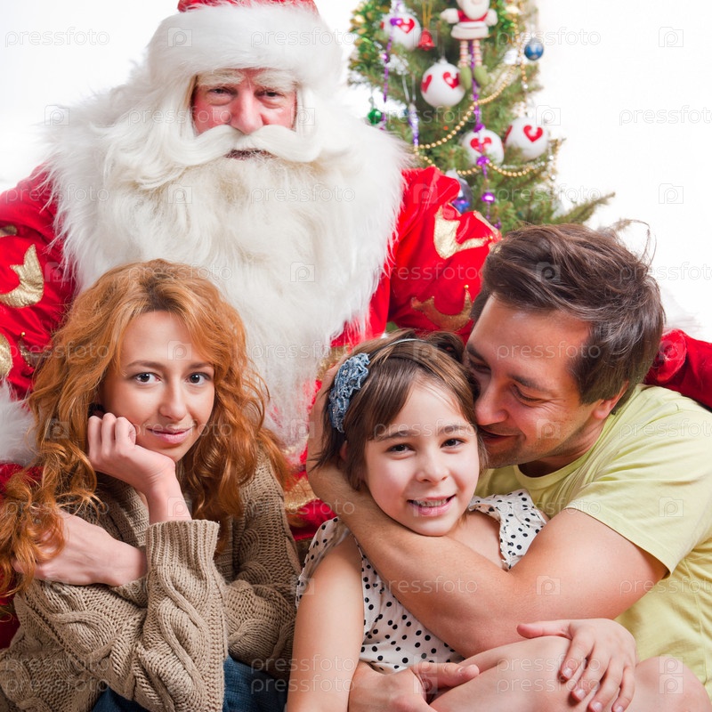 Счастливая семья и Дед Мороз возле рождественской елки с подарками