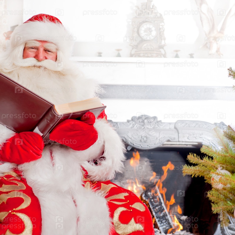 Дед Мороз читает книгу у камина