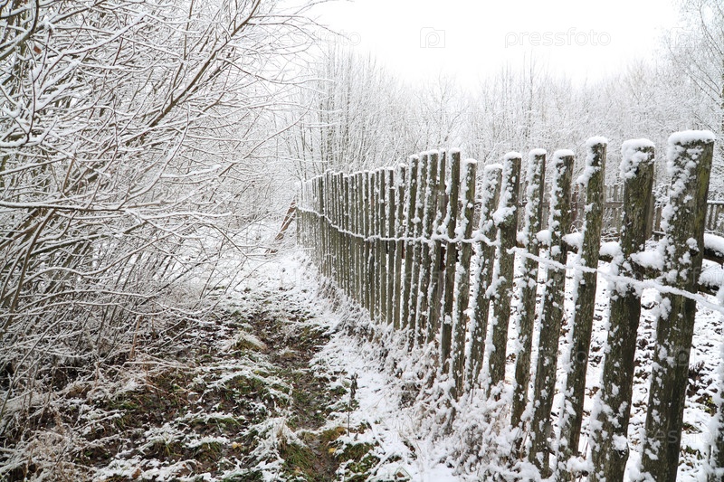 Старый забор среди заледеневших деревьев