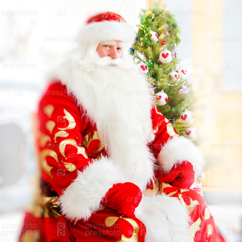 Дед Мороз в красном кафтане сидит возле елки и камина
