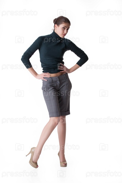 Молодая брюнетка в коротких штанах и черном свитере
