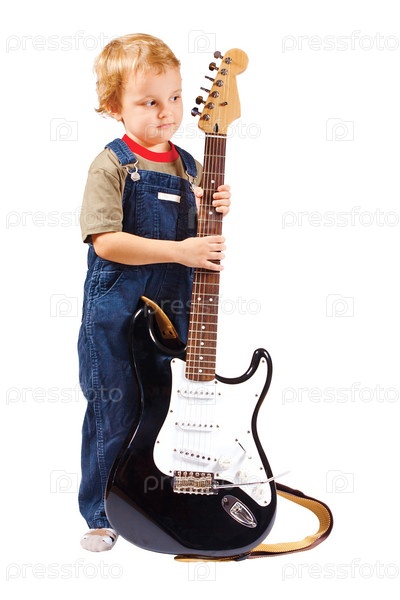 Маленький мальчик с электрогитарой на белом фоне