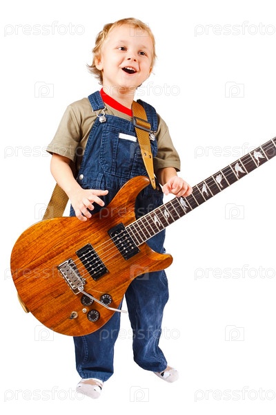 Маленький мальчик с электрогитарой на белом фоне