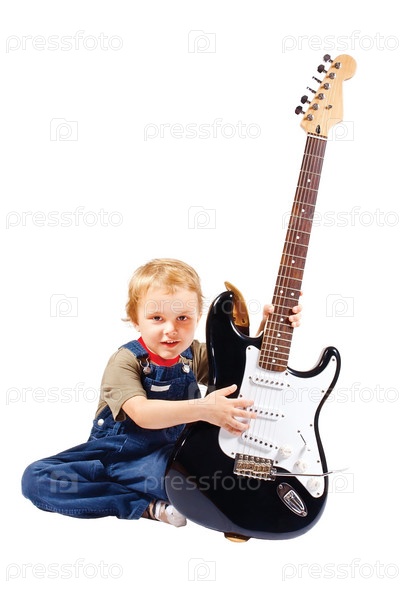 Маленький мальчик с электрогитарой на белом фоне