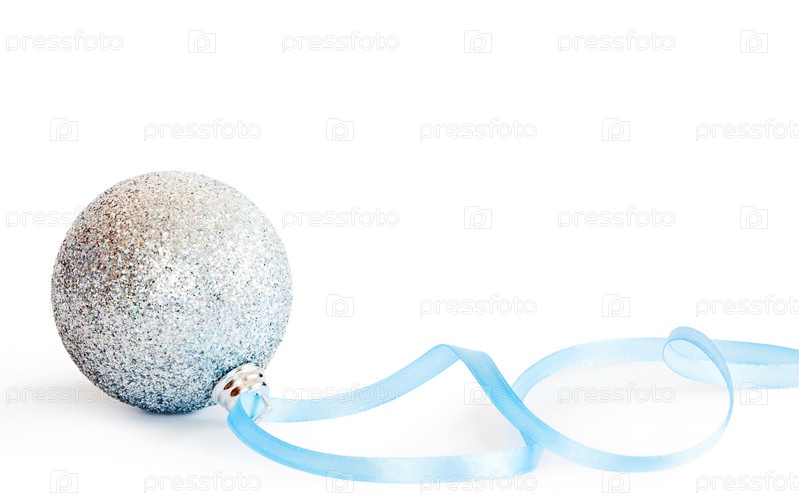 Серебряный новогодний шар с голубой лентой на белом фоне