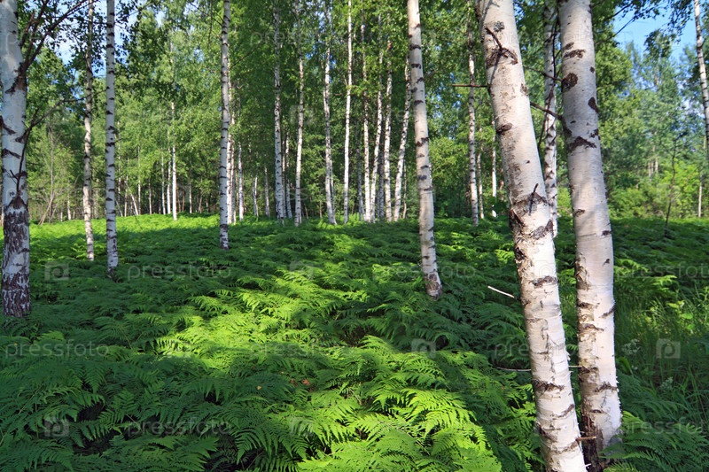 Зеленый папоротник среди берез