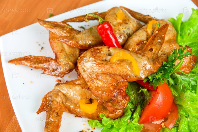 Жареные куриные крылышки украшенные свежим зеленым салатом, перцем и зеленью