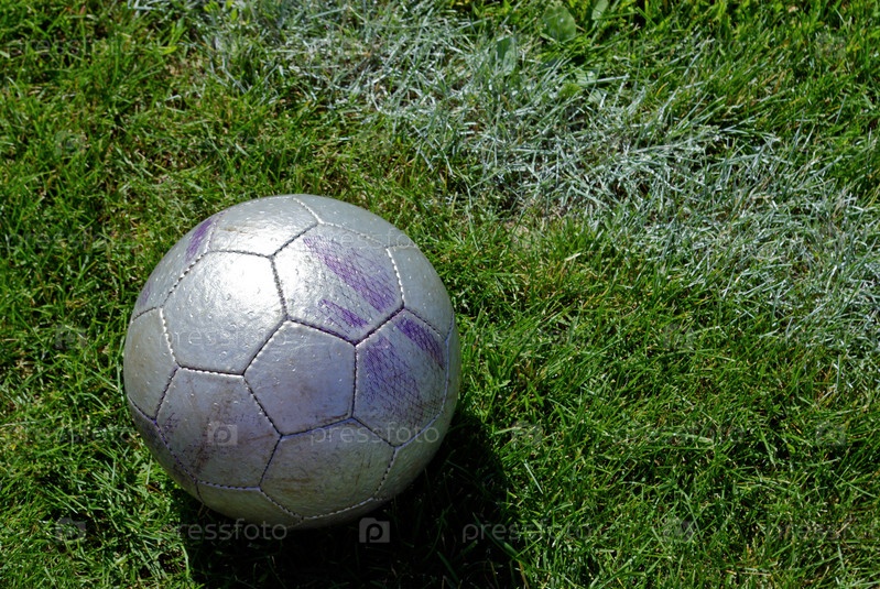 Старый футбольный мяч на зеленом поле