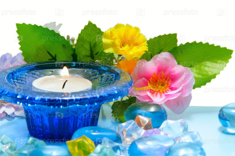 Свечка и искусственные цветы крупным планом