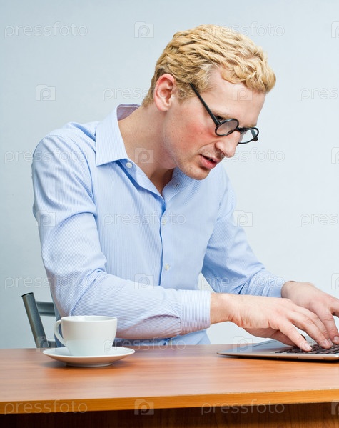 Молодой человек в очках сидит перед ноутбуком, серый фон