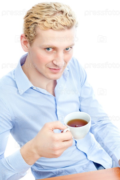Красивый молодой человек с чашкой чая за столом, белый фон