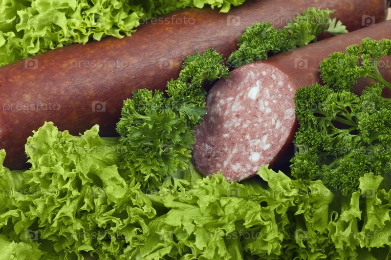 Колбаса с петрушкой и листьями салата