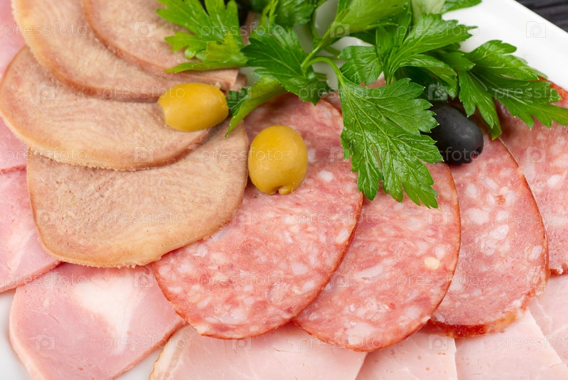 Мясное ассорти из говядины язык, колбасы, мяса и ветчины с зеленью