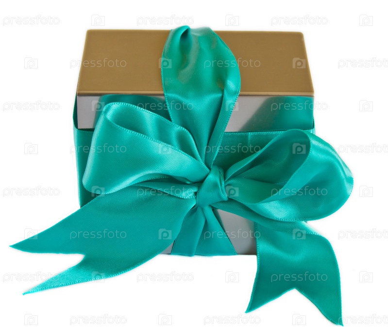 Подарочная коробка с большим голубым бантом, изолированная на белом фоне