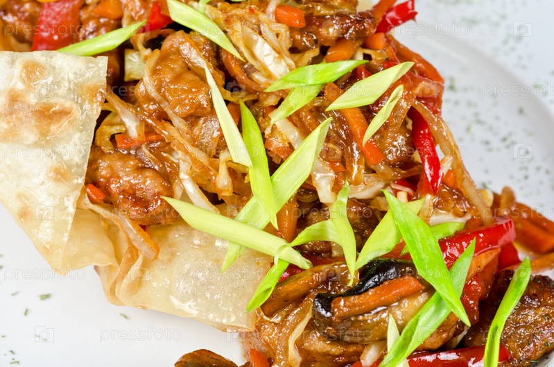 Жареная говядина в кисло-сладком соусе на тарелке