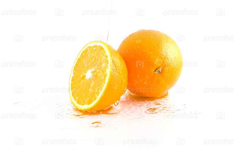 Два красных апельсина, брызгающих водой на белом фоне