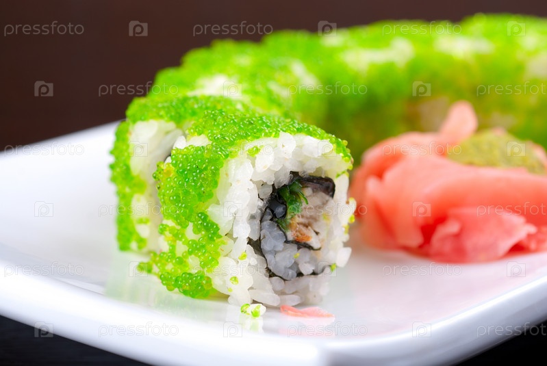 Суши филадельфия, приготовленные из лосося, авокадо, сыра и икры летучей рыбы тобико