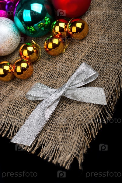 Новогодние елочные украшения и серебристый бант на мешковине и на черном фоне