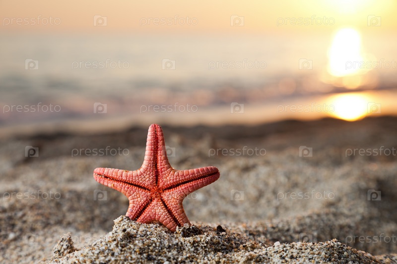 Морская звезда в песке на закате солнца