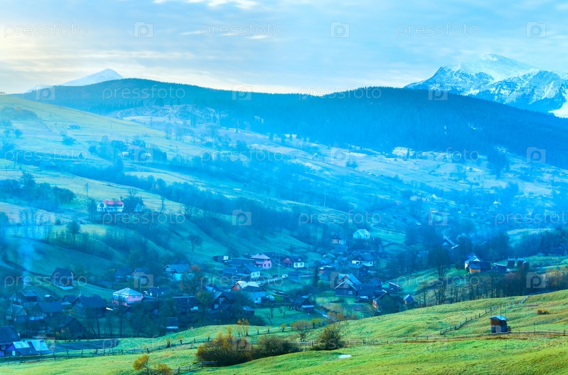 Туманный рассвет ранней осенью в Карпатских горах Украины. Горы Говерла и Петрос издалека