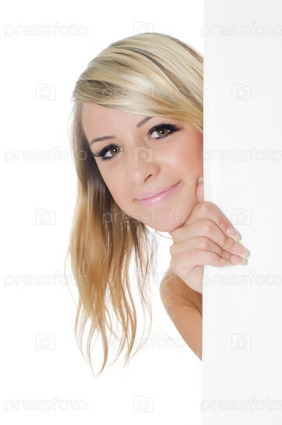 Портрет молодой женщины, держащей пустой рекламный щит