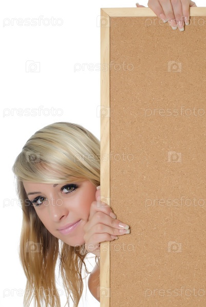 Портрет молодой женщины, держащей пустой рекламный щит