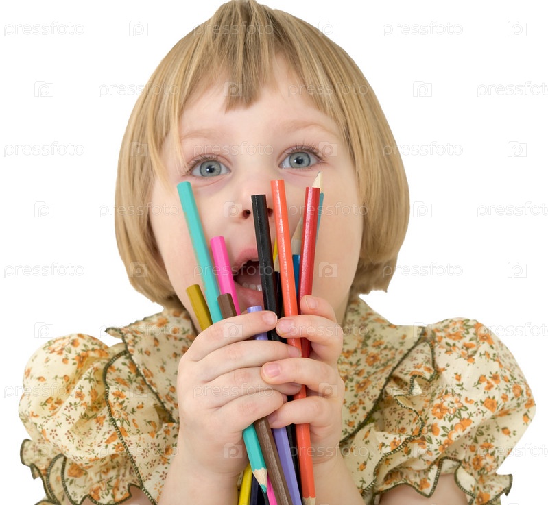 Маленькая девочка с карандашами на белом фоне