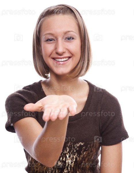 Молодая девушка с протянутой ладонью на белом фоне