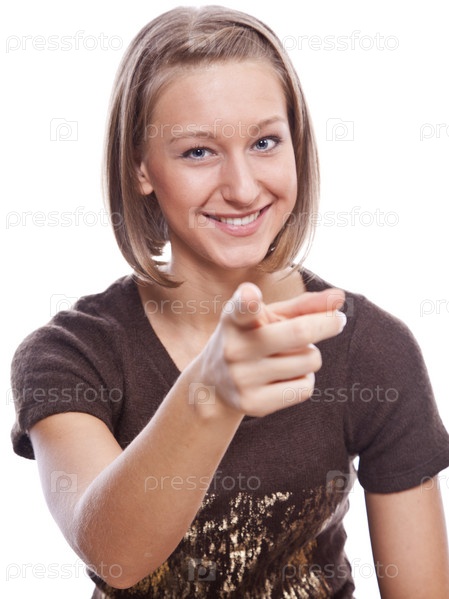 Молодая девушка указывает пальцем в камеру на белом фоне