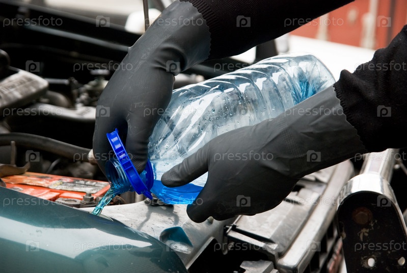 Механик заливает промывочную жидкость в автомобиль
