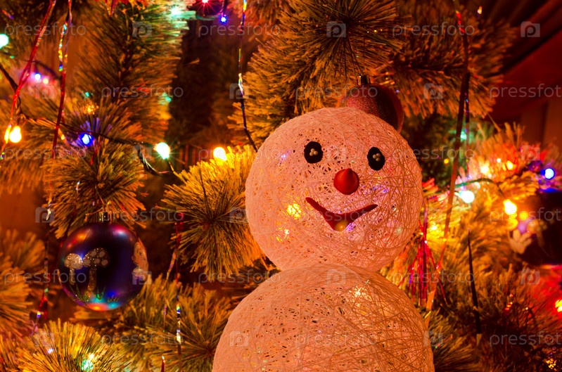 Игрушечный снеговик на фоне рождественской елки