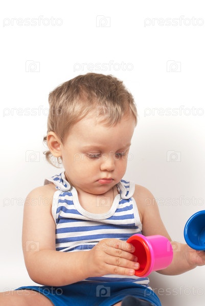 Маленький мальчик с игрушкой на белом фоне