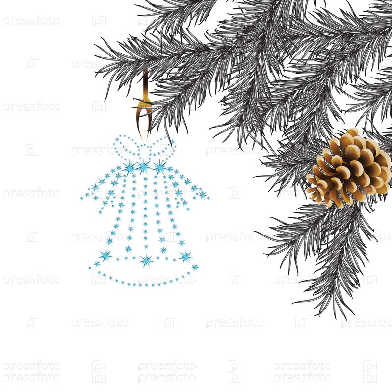 Новогодняя сосна, колокольчик и шишка на белом фоне