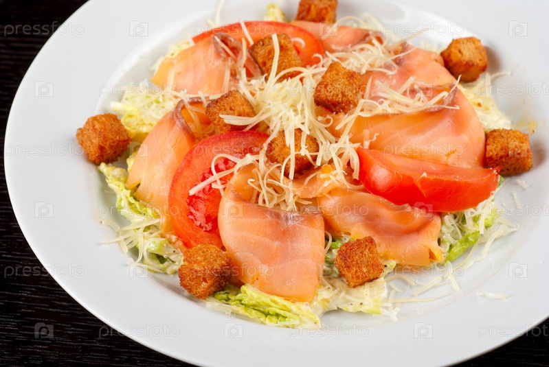 Салат из филе лосося, овощей, сыра и сухариков